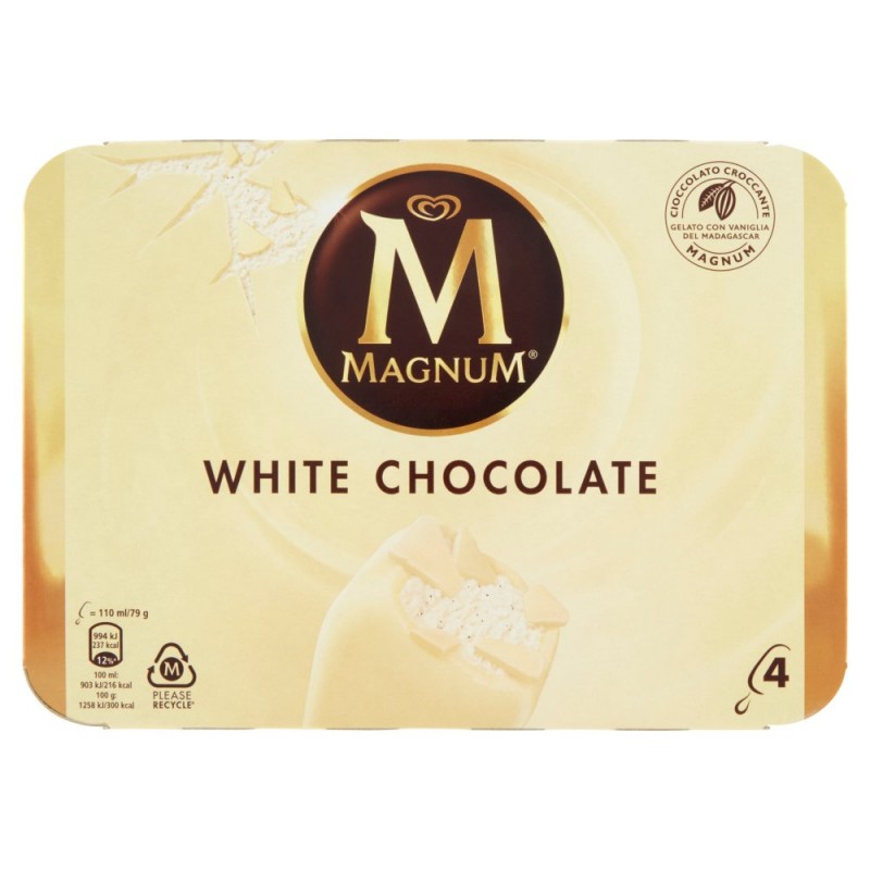Magnum x la sostenibilita' / Ogni Magnum e' realizzato con cura, con costante attenzione ai temi della sostenibilita', utilizzando ingredienti di Alta Qualita' per offrire sempre un'esperienza unica. / / Vaniglia del Madagascar / Il cremoso gelato con estratto di vaniglia del Madagascar, proveniente da fonti gestite responsabilmente, si combina perfettamente con il cioccolato Magnum. / / Cioccolato croccante Magnum / L'esclusivo cioccolato Magnum nasce da semi di cacao certificati Rainforest Alliance selezionati e tostati con cura, per garantire un piacere autentico e la croccantezza unica di Magnum ad ogni morso. / / Dai semi di cacao al morso / I semi di cacao Magnum vengono coltivati e raccolti in modo responsabile presso coltivazioni certificate Rainforest Alliance, rispettando l'ambiente e sostenendo i coltivatori locali. / / Rispettando le risorse forestali / Il legno e la carta utilizzati per la produzione di stecchi e confezioni esterne derivano da foreste gestite in maniera sostenibile. / Ingredienti: LATTE scremato reidratato, Zucchero, Burro di cacao¹, Acqua, Olio di cocco, Sciroppo di glucosio, LATTE intero in polvere, Sciroppo di glucosio-fruttosio, LATTOSIO e proteine del LATTE, BURRO concentrato, LATTE scremato in polvere, Emulsionanti (E471, E442, E476), Baccelli di vaniglia, Addensanti (E412, E410, E407), Aroma naturale di vaniglia¹ (contiene LATTE), Aromi, Coloranti (E160a), Puo' contenere: soia, mandorle, Senza glutine, ¹Certificato Rainforest Alliance