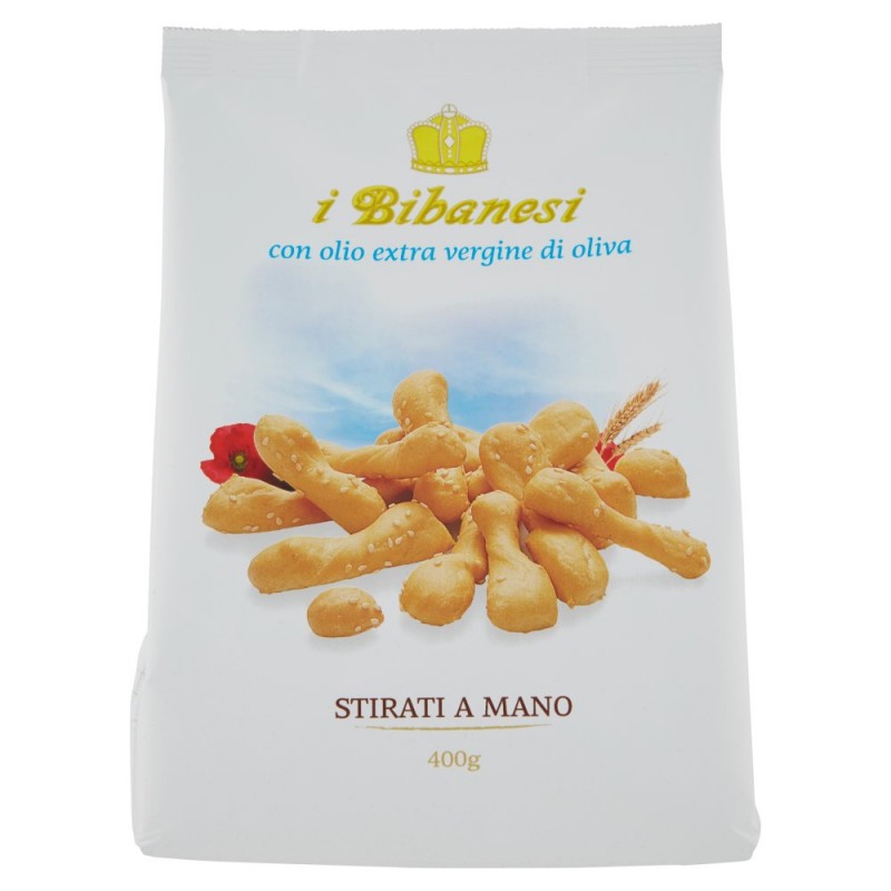 classic - Gli originali stirati a mano / / Il profumo del pane, quello vero, non e' una cosa che si sente tutti i giorni. / Se poi al pane si aggiunge l'olio extra vergine di oliva, insieme ad alcuni ingredienti selezionati con cura, il pane diventa unico. / Ecco che nascono i Bibanesi: una ricetta semplice, senza additivi e conservanti. / L'impasto riposa per almeno un giorno, come si faceva il pane una volta, e qui sta il segreto della loro inconfondibile croccantezza. / Cosi' leggeri i Bibanesi sono modellati e stirati con le mani, uno a uno, e per questo sono tutti diversi...Ma proprio tutti! / E se trovate un panetto dalla forma insolita e un po' curiosa, non e' altro che la prova che i Bibanesi nascono dalle nostre mani. / Ingredienti: Farina di grano tenero tipo 0, Olio extra vergine di oliva (12%), Strutto, Sale, Estratto di malto (orzo, grano), Farina di cereali maltati (orzo, grano), Lievito, Spolvero in superficie con semi di sesamo (0,2%), Puo' contenere tracce di soia