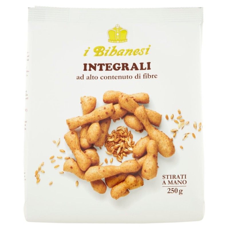 In un 'nido' speciale e fragrante e' racchiusa tutta la bonta' dei Bibanesi Integrali e sono custoditi i chicchi del grano da cui prendono vita. Nei Bibanesi Integrali si ritrovano l'esperienza e la passione di chi coltiva la terra, il lavoro prezioso dell'uomo, che con le mani da' forma ad ogni panetto; il rispetto della natura e di una lavorazione artigianale che, senza l'aggiunta di alcun additivo, assicura all'impasto un tempo lunghissimo di lievitazione. I Bibanesi sorprendono per la semplicita' dei loro ingredienti e i fiocchi di frumento ne esaltano l'integralita', trasformandoli in un pane ad alto contenuto di fibre, ideale per una corretta alimentazione e, nel contempo, gustoso per la sua croccante fragranza. / / Stirati a mano / / Avvertenza: Piccole ammaccature superficiali ed eventuali variazioni nella forma e nell'aspetto avvalorano in modo inconfondibile un processo di lavorazione artigianale. / Ingredienti: Farina di grano tenero tipo 0, Farina integrale di grano tenero (22%), Fiocchi di frumento (12%), Olio extra vergine di oliva, Strutto, Sale marino, Estratto di malto (orzo, grano), Farina di cereali maltati (orzo, grano), Lievito, Aromi naturali, Puo' contenere tracce di sesamo e soia