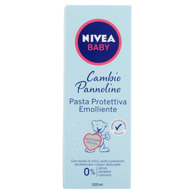 - Tutta la protezione di Nivea per il tuo bambino / - Ingredienti selezionati e particolarmente affini alla pelle sensibile del bambino - Sviluppato in collaborazione con dermatologi e pediatri - Compatibilita' cutanea clinicamente e dermatologicamente comprovata. / *Formula altamente tollerabile per ridurre il rischio di allergie / / Garantisce una protezione affidabile dagli eritemi da pannolino. Aiuta a prevenire rossori e irritazioni. / / Come funziona? / - La speciale formulazione con il 20% di Ossido di Zinco e' resistente all'acqua e crea un'efficace barriera traspirante che mantiene la pelle asciutta nella zona del pannolino. Aiuta a proteggere dalla irritazioni - La formula arricchita con Pantenolo rafforza la naturale barriera protettiva della pelle e aiuta a lenire le irritazioni - Si stende facilmente per non infastidire la pelle delicata del tuo bambino. / Ingredienti: Cera Microcristallina, Zinc Oxide, Lanolin, Paraffinum Liquidum, Talc, Glycerin, Aqua, Polyglyceryl-3 Diisostearate, Panthenol, Magnesium Sulfate, Parfum