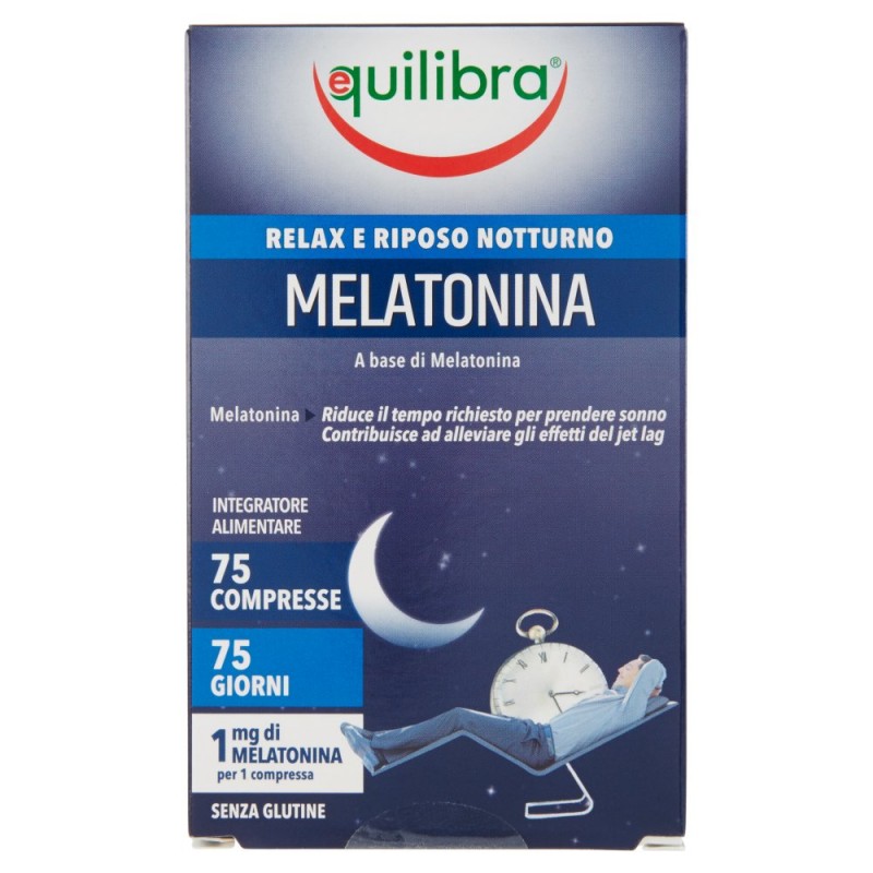 Melatonina / Melatonina Equilibra® e' un integratore alimentare di melatonina. L'uso della melatonina riduce il tempo richiesto per prendere sonno e puo' contribuire ad alleviare gli effetti del jet lag. / / Si consiglia l'utilizzo per: / - il buon sonno / - alleviare gli effetti del jet lag / - ridurre il tempo necessario a prendere sonno / / I vantaggi delle compresse / Equilibra® studia attentamente i propri prodotti: oltre all'accurata scelta delle materie prime ricerca i veicoli migliori per rendere i componenti principali rapidamente ed efficacemente disponibili per l'organismo, per offrire ai propri consumatori il miglior standard qualitativo possibile. Le compresse, prive di coloranti, consentono di avere un prodotto ad alta concentrazione, dosato accuratamente. / Ingredienti: Agenti di carica: cellulosa microcristallina, calcio fosfato bibasico, Agenti antiagglomeranti: sali di magnesio degli acidi grassi, Melatonina