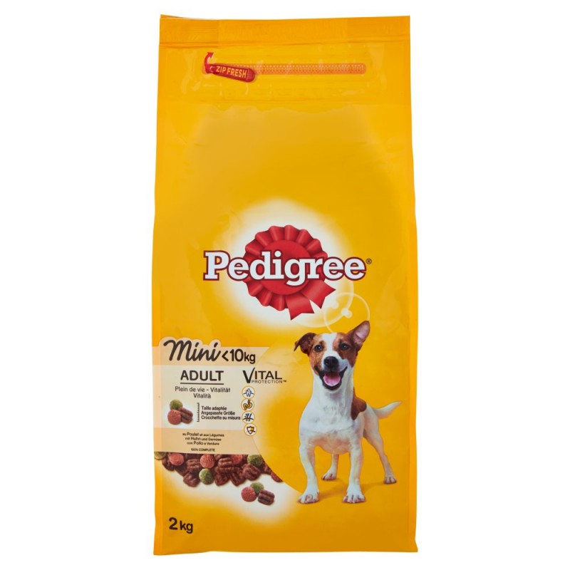 Pedigree Vital Protection e' un alimento secco creato per soddisfare quattro bisogni fondamentali: il prodotto aiuta a mantenere un sistema immunitario forte, pelle e pelo lucido, una digestione ottimale e una corretta igiene orale. Pedigree Vital Protection aiuta a mantenere il tuo cane in salute e pieno di vitalita'. / / Vitalita' / Con vitamina B e minerali per aiutare a mantenere il tuo cagnolino pieno di vitalita'. / / Igiene orale / Ogni cane merita una bocca sana. Dato che i cani vivono la loro vita attraverso la bocca e mantenere denti e gengive in buono stato e' fondamentale, abbiamo realizzato Pedigree Adult Mini. Queste crocchette contengono uno speciale ingrediente attivo che aiuta a prevenire la formazione del tartaro e hanno una consistenza appositamente studiata per aiutare a mantenere i denti puliti. / Digestione / Ogni cane merita un intestino attivo. I nostri prodotti contengono fibre naturali e proteine di elevata qualita' che favoriscono una digestione ottimale. / Pelle e pelo / Ogni cane merita di avere un aspetto sano e di sentirsi in forma. Le nostre ricette con olio di girasole - una fonte naturale di Omega 6 - e zinco aiutano a mantenerlo bello e a sentirsi bene. / Sistema immunitario / Ogni cane merita di avere un po' di extra-difesa. Le nostre ricette contengono vitamina E, conosciuta per la sua funzione antiossidante, e minerali selezionati che aiutano il sistema immunitario del tuo piccolo cane, cosi' non dovrai preoccuparti quando va in giro ad annusare tutto quando tu non lo stai guardando. / / Sviluppato dai nostri veterinari / Senza aromi artificiali aggiunti - Senza esaltatori di sapidita' aggiunti / / Realizzato dai nostri nutrizionisti e veterinari di Waltham / www.waltham.com / Ingredienti: Composizione:, Cereali, Carni e derivati (di cui 4% pollo nei croccantini marrone), Oli e grassi (di cui 0.5% di oli odi girasole), Sottoprodotti di origine vegetale (di cui 2% polpa di barbabietola essiccata), Sostanze minerali (1.9%, di cui 0.7% tripolifosfato di sodio, ingrediente attivo sulle crocchette marroni), Ortaggi (carote 4% nei croccantini arancioni, piselli 4% nei croccantini verdi), Estratti di proteine vegetali