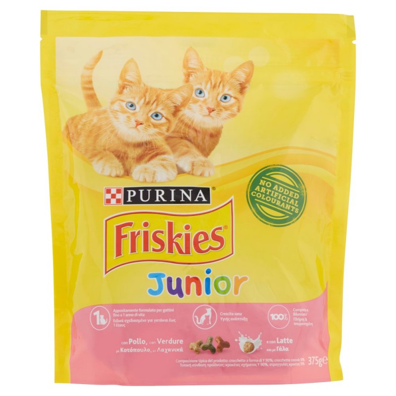 - I gattini sono esploratori di natura, curiosi verso tutto cio' che li circonda. / E' questo che li rende membri della famiglia cosi' affascinanti e che porta vitalita' nella nostra casa. Da giovani i gatti spendono ogni giorno molta energia in nuove avventure, e noi vogliamo nutrire questo loro amore naturale per la scoperta supportando i loro bisogni fisici. / Per questo gli esperti PURINA hanno creato FRISKIES Junior: alimenti per gatti deliziosi e di qualita', bilanciati con cura per rispondere ai bisogni dei gattini con una nutrizione specifica, per un inizio sano e felice della loro vita piena di avventure e vitalita'. / / Proteine di qualita' per favorire una crescita sana / Vitamine e Minerali per aiutare la crescita di denti e ossa forti / Vitamina E per supportare le sue difese naturali / Taurina per favorire un cuore sano e una buona vista / / - No added artificial colourants / - Appositamente formulato per gattini fino a 1 anno di vita / - Crescita sana / - 100% Completo e Bilanciato / Ingredienti: COMPOSIZIONE:, Cereali, Carni e derivati (10%*), Estratti di proteine vegetali, Oli e grassi, Ortaggi (0,7%**), Sostanze minerali, Pesci e sottoprodotti dei pesci, Latte e derivati del latte (0,09%***), Lieviti, *equivalente a 20% di carni e derivati reidratati, con min. 4% di pollo nelle crocchette a forma di Y, equivalente a 3,6% di pollo nel prodotto, **equivalente a 4% di ortaggi reidratati nelle crocchette a forma di Y, con 0,6% equivalente a 3,6% di ortaggi nel prodotto, ***equivalente a 0,32% di latte e derivati reidratati, con 4% di latte nelle crocchette rotonde