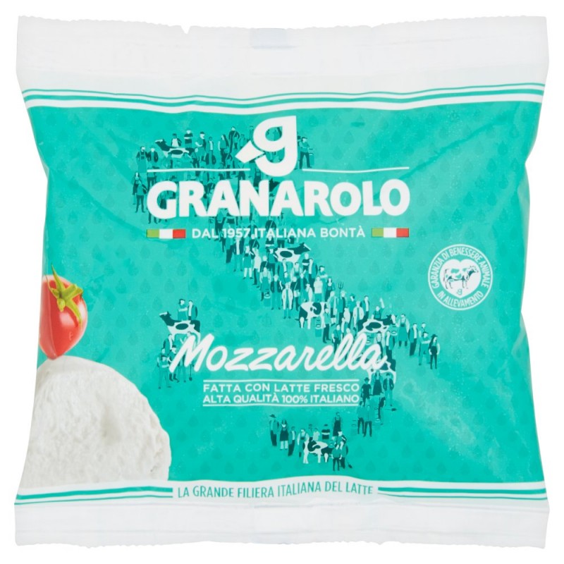 Adatta per un'alimentazione vegetariana / / Mozzarella / Fatta con solo latte italiano della nostra filiera / - Italiana / Il latte e' dei nostri 700 allevatori presenti in 12 regioni / Settecento allevatori in Italia / - Certificata / Assicuriamo ogni giorno il benessere delle nostre 70milla mucche (certificazione CSQA*) / Garanzia di benessere animale in allevamento / - Garantita / Effettuiamo oltre 400milla controlli su tutta la filiera per offrirti un latte buono e controllato / Qualita' Granarolo garantita / *DTP 122 - Cert. CSQA n. 53446 / Ingredienti: Latte pastorizzato, Sale, Caglio microbico, Correttore d'acidita': acido citrico (E330), Prodotto con latte fresco pastorizzato di Alta Qualita', in conformita' al D.M. 185/91