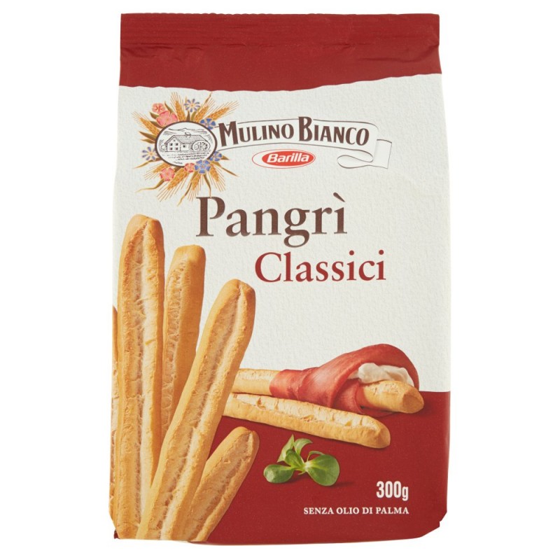 - Il buono che non vedi / - Tutti i nostri grissini sono senza grassi idrogenati, senza coloranti e senza olio di palma. / - Per la nostra produzione acquistiamo 100% energia elettrica da fonti rinnovabili. / / Tutto il buono che senti / Farina di grano tenero + Olio di girasole / I Pangri' sono grissini rustici con tutto il sapore del buon pane. / Preparati con pochi e semplici ingredienti, come la farina di grano tenero e l'olio di girasole. / / www.mulinobianco.it / Ingredienti: Farina di grano tenero tipo ''0'' 96g*, Olio di girasole 11g*, Lievito, Sale, Estratto di malto d'orzo e mais, *per 100 grammi di prodotto finito, Puo' contenere tracce di: frutta a guscio, latte, sesamo, soia e uova