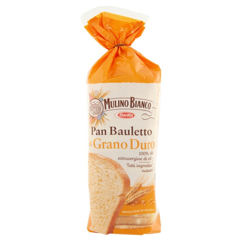 Tutto il buono che senti / Semola di grano duro + Olio extra vergine di oliva / La semola di grano duro e' l'ingrediente caratteristico di questo pane preparato solo con ingredienti naturali. / Dalla sua unione con l'olio extravergine di oliva nasce un pane morbido dal colore e dal sapore inconfondibili. / www.mulinobianco.it / Ingredienti: Semola rimacinata di grano duro 67,1%, Acqua, Olio extravergine di oliva 2,8%, Lievito, Sale, Zucchero, Glutine di frumento, Farina di orzo maltato, Farina di grano tenero tipo '0', Trattato con alcool etilico in superficie, Puo' contenere tracce di: frutta a guscio, latte, sesamo, soia e uova