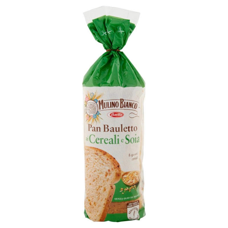 Con farina di grano tenero di agricoltura sostenibile / Al Mulino tutto e' fatto #perdartilmeglio / Il Pan Bauletto ai cereali e Soia Mulino Bianco e' fatto con Farina di grano tenero da Agricoltura Sostenibile rispettando le 10 regole della Carta del Mulino. / La Carta del Mulino e' il nostro disciplinare per la coltivazione sostenibile del grano tenero. Porta qualita' nei prodotti, supporta il lavoro della comunita' di Agricoltori e promuove la Biodiversita' favorendo gli insetti impollinatori. / Scopri le 10 regole della Carta del Mulino su: www.mulinobianco.it/lacartadelmulino / La Carta del Mulino prevede il rispetto dei criteri di sostenibilita' ISCC Plus ed e' stata scritta in collaborazione con il Dipartimento di Scienze e Tecnologie Agro-Alimentari dell'Alma Mater Studiorum-Universita' di Bologna. / www.mulinobianco.it / Ingredienti: Farina di grano tenero tipo '0' 56%, Acqua, Miscela di fiocchi e farine di cereali 5,9% [avena, orzo, farro (grano), grano duro, mais, riso, segale, miglio], Granella di soia 5,1%, Olio di girasole 3,6%, Lievito, Glutine di frumento, Sale, Farina di orzo maltato, Estratto di malto d'orzo, Trattato con alcool etilico in superficie, Puo' contenere tracce di: frutta a guscio, latte, sesamo e uova
