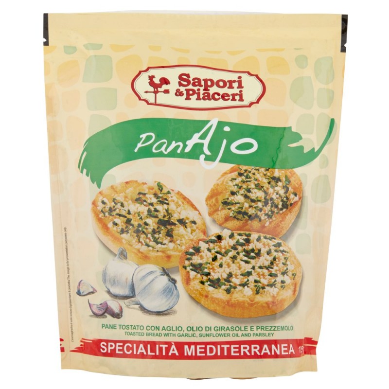 - Una Linea di saporiti e fragranti Snack creata per le tue feste, per la famiglia e i momenti di pausa. / Sfiziosi Crostini gia' pronti da gustare o da utilizzare come base in fantasiosi appetizer per il tuo Happyhour... / / .. con Fantasia / - PanAjo e pomodorini / - PanAjo e gorgonzola / - PanAjo e salame / Ingredienti: Farina di frumento, Condimento (olio di girasole raffinato 22%, aglio 0,1%, sale), Olio di girasole raffinato 8%, Lievito, Sale, Prezzemolo 0,4%, Miglioratore per panificazione (farina di frumento, agente antiagglomerante E170i, emulsionante E472e, antiossidante E300 ed enzimi), Zucchero, Puo' contenere tracce di arachidi, soia, latte e derivati e sesamo