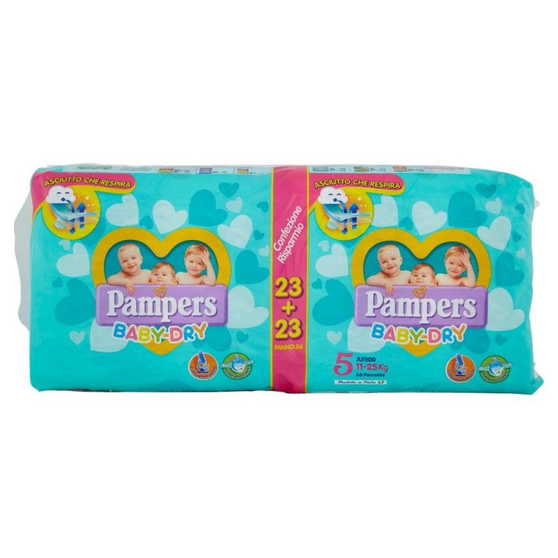 Pampers Baby-Dry e' il pannolino che offre al tuo bambino un 'Asciutto che Respira'. Grazie alla sua struttura super assorbente e ai suoi materiali traspiranti, blocca il bagnato lontano dalla pelle, mentre lascia passare liberamente l'aria al suo interno per una naturale traspirabilita'. Cosi' la sua pelle e' protetta, asciutta e libera di respirare. / / Elastiche... ...fino a 10 cm / Lozione con aloe / Speciali barriere tienitutto / Asciutto che respira / Ingredienti: Lozione ingredients:, Petrolatum, Stearyl Alcohol, Paraffinum Liquidum, Aloe Barbadensis Extract, CI 61565