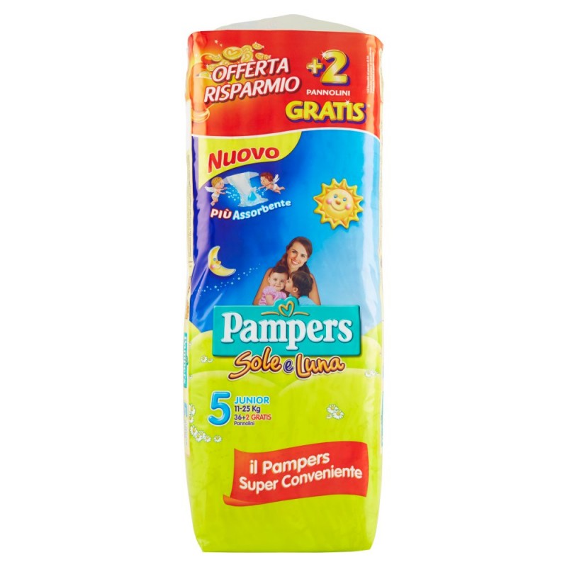 - Mamma, scopri il Nuovo Pampers Sole e Luna. E' Piu' Assorbente perche' da oggi ancora piu' ricco di microgranuli assorbi-pipi', per aiutarti a evitare le fuoriuscite e per proteggere la pelle del tuo bambino. Cosi' puoi dargli l'asciutto e la protezione di cui ha bisogno, ad un prezzo super conveniente. / / Nuovo - Piu' Assorbente / Delicata essenza camomilla / Orecchiette elastiche / Lozione con aloe / Ingredienti: Lozione - Ingredients:, Petrolatum, Stearyl Alcohol, Paraffinum Liquidum, Aloe Barbadensis Extract, CI 61565