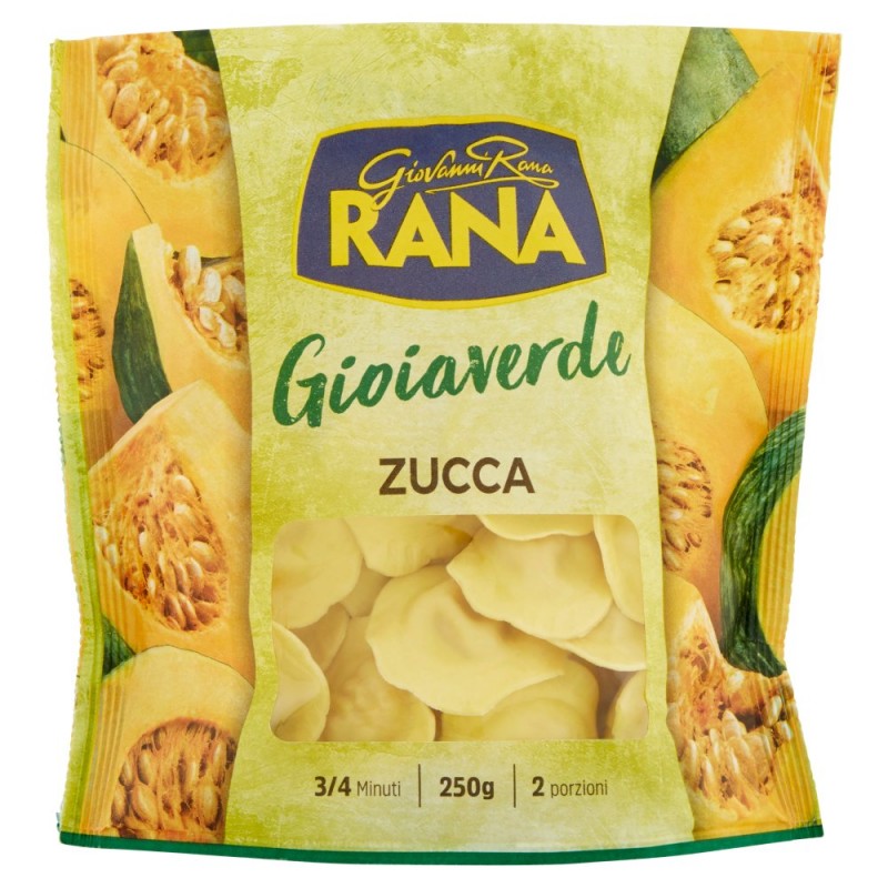 Ripieno 52%: purea di zucca 49%, pangrattato (farina di grano tenero, acqua, sale, lievito), ricotta (siero di latte, latte, sale), fibre vegetali (contengono frumento), mostarda (mele cotogne, zucchero, aroma naturale), lattosio, panna (contiene latte), amido di patata, burro, amaretti (zucchero, mandorla di albicocca, albume d'uovo, aroma naturale), sale, aromi naturali (contengono latte), Pasta 48%: farina di grano tenero, uovo 30%, semola di grano duro, Prodotto in uno stabilimento che utilizza anche frutta a guscio, pesce, crostacei, molluschi e sedano