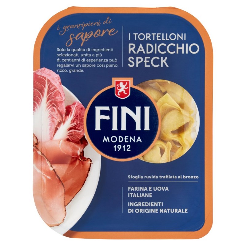 Pasta 52%: farina di grano tenero 65%, uova 20%, semola di grano duro, acqua, Ripieno 48%: ricotta (siero di latte, crema di latte), pangrattato (farina di grano, sale), radicchio di Chioggia IGP 13%, speck 9% (carne di suino, sale, spezie, piante aromatiche, destrosio, zucchero, aromi naturali), siero di latte in polvere, olio di semi di girasole, patate disidratate, fibra vegetale, sale, cipolla, aromi naturali, proteine del latte, Puo' contenere tracce di frutta a guscio