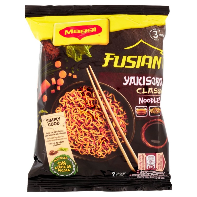 MAGGI YAKISOBA GUSTO CLASSICO, gustosi Noodles da cucinare e saltare in padella, per preparare in pochi minuti uno dei piatti tipici della cucina giapponese, con l'aggiunta di verdure e salsa di soia che trovi nella confezione. / / - Noodles con Verdure, Spezie e Salsa con Soia all'interno della confezione / - Gusto classico / - Per gli amanti della cucina orientale / - Pronti in 3 minuti in padella / - Da personalizzare con gli ingredienti che preferisci / - 2 Porzioni / / Yakisoba classico con pollo zenzero e sedano / Ingredienti per 2 persone / • 1 confezione di Yakisoba Classico Maggi / • 1 petto di pollo / • 1 cucchiaio di olio di semi / • 1 cucchiaino di pepe nero macinato / • 1 spicchio d'aglio / • 1 cucchiaino di zenzero / • 3 gambi di sedano / • 1 cipolla / • Sesamo bianco e nero / Preparazione / STEP 1: Scaldate l'olio d'oliva a fuoco medio in una padella larga. Aggiungete il pollo, il pepe nero, l'aglio e lo zenzero grattugiato. (Mentre il pollo inizia a cuocersi, mondate e tagliate a fettine il sedano. Tagliate la cipolla in quarti e poi a fettine sottili.) / STEP 2: Quando il pollo e' quasi cotto, aggiungete la cipolla, il sedano / STEP 3: Unite il contenuto dei tre sacchetti che trovate nella confezione di Yakisoba e l'acqua necessaria alla cottura dei noodles. Fate cuocere secondo le modalita' di preparazione e fino al completo assorbimento dell'acqua. / / Vuoi provare un gusto diverso? Prova MAGGI YAKISOBA GUSTO CLASSICO, e per dare sfogo alla tua creativita' aggiungi a YAKISOBA gli ingredienti freschi che hai in casa. Scopri tutte le ricette su www.buonalavita.it / Ingredienti: Noodles 76,7%: farina di frumento, olio di girasole, glutine di frumento, sale, correttore di acidita' (carbonati di potassio), stabilizzante (polifosfati), Salsa 12,5%: acqua, zucchero, olio di girasole, sale, zucchero caramellato, pomodoro in polvere, estratto di lievito, salsa di soia in polvere (contiene glutine), correttore di acidita' (acido citrico), olio di sesamo, amido di mais, Vegetali disidratati 6,6%: cavolo bianco 4,3%, carota 1,5%, erba cipollina 0,8%, Insaporitore 4,2%: zucchero, amido di mais, salsa di soia in polvere (contiene glutine), aromi, estratto di lievito, zucchero caramellato, spezie (peperoncino, zenzero, pepe nero, cannella 0,2%, cumino, alloro), vegetali disidratati (aglio, cipolla), olio di girasole, Puo' contenere sedano, uovo, latte, senape