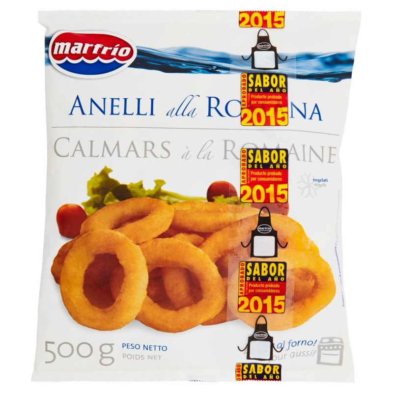 Totano atlantico (molluschi) (*) (Illex argentinus), Stabilizzanti (E339), Antiossidanti (E301, E331), Pastellato (*): farina di frumento (glutine), fecola di mais, acqua, olio di semi di girasole, sale, aroma naturali (aglio e limone), agenti lievitanti (E-500, E-450), addensante (E-412), colorante (E-101), Puo' contenere tracce di pesce e crostacei