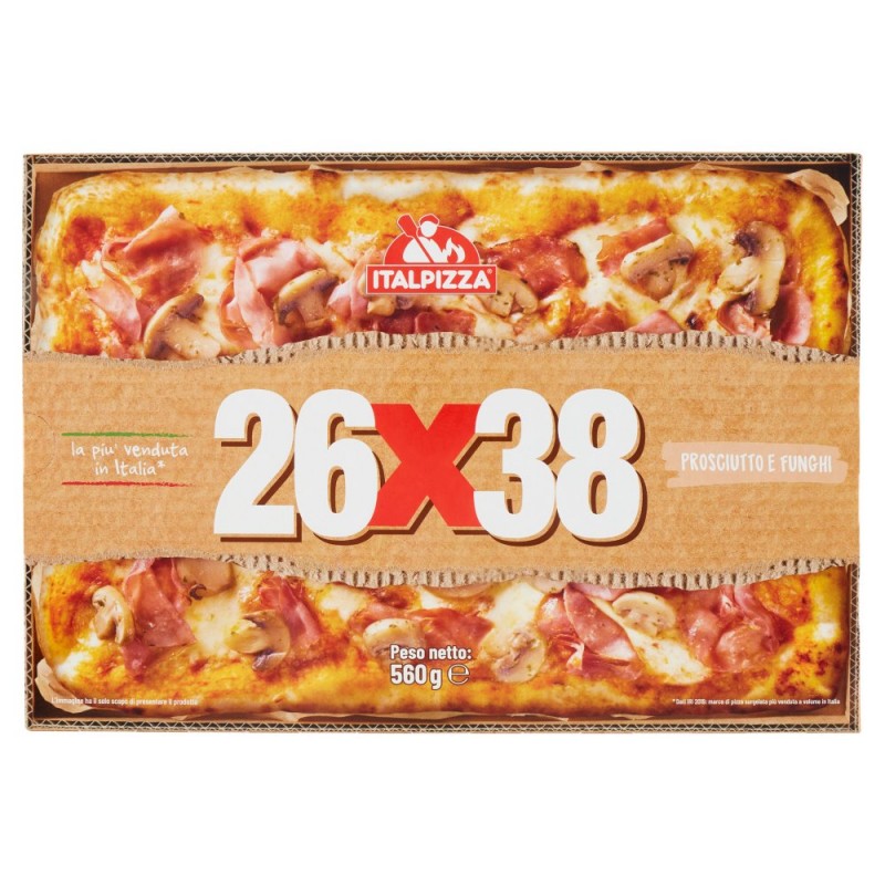 Impasto (farina di grano tenero, acqua, olio extra vergine di oliva, sale, lievito), Mozzarella (latte, sale, caglio microbico, fermenti lattici), Salsa di pomodoro (polpa di pomodoro, zucchero, sale), Prosciutto cotto 10,7% [carne di suino, acqua, sale, destrosio, maltodestrine, antiossidante: ascorbato di sodio, estratti di rosmarino; estratti di spezie (aglio, macis, pepe), aroma di affumicatura, conservante: nitrito di sodio], Funghi conditi 8,9% [funghi champignon (Agaricus bisporus), olio di oliva, acqua, prezzemolo, sale, cipolla, aglio], Olio di semi di girasole, Puo' contenere tracce di soia