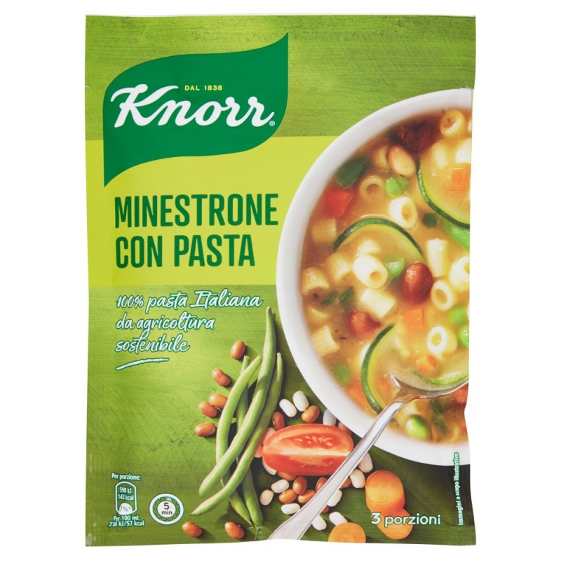 - Lo sapevi che grazie alla disidratazione degli ingredienti garantiamo la qualita' delle nostre ricette per diversi mesi, senza l'utilizzo di conservanti? / / Il nostro impegno / Con ingredienti naturali / Fonte di proteine / Fonte di fibre / Disidratato con cura / Per saperne di piu', vai a https://www.knorr.com/it/Sostenibilita / Ingredienti: Pasta di semola di GRANO duro 35,6%, Patate, Fagioli cannellini 4,9%¹, Fagioli borlotti 4,6%, Cipolle¹, Farina di FRUMENTO, Purea di pomodoro 2,7%¹, Zucchero, Carote 2,3%¹, Sale iodato, Olio extra vergine d'oliva, Porro¹, Fagiolini 1,5%¹, SEDANO RAPA¹, Estratto per brodo, Piselli¹, Cavolo¹, Zucchine¹, LATTE scremato, Estratto di lievito, Sale, Spinaci¹, Aromi, Succhi vegetali concentrati (SEDANO, carote, porro, cipolla), PANNA, Cavolfiore¹, Curcuma¹, Puo' contenere uova, soia e senape, ¹ Da agricoltura sostenibile, Senza conservanti aggiunti, Senza coloranti, Senza glutammato monosodico aggiunto