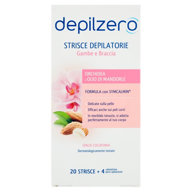 - Nuova formula con Symcalmin / Le strisce Depilzero Gambe e Braccia formulate con Symcalmin in sinergia con gli estratti di Orchidea e Olio di Mandole, rispettano la pelle, anche la piu' delicata, lasciandola morbida e liscia come la seta. La formula, senza colofonia, e' inoltre dermatologicamente testata per la massima sicurezza e tollerabilita'. / / Le strisce depilatorie per gambe e braccia Depilzero, garantiscono efficacia e delicatezza anche sulla pelle piu' sensibile, per un'eliminazione facile e veloce dei peli superflui. Realizzate in morbido tessuto, si adattano perfettamente alle forme del tuo corpo assicurando risultati perfetti e duraturi. / Le salviettine post-epilazione sono ideali per eliminare eventuali residui di cera, e grazie all'azione emolliente e dermoprotettiva, lasciano la pelle morbida e liscia come la seta. / Ingredienti: Hydrogenated Styrene/Methyl Styrene/Indene Copolymer, Petrolatum, Paraffinum Liquidum, Cera Alba, Cymbidium Great Flower Extract, Prunus Amygdalus Dulcis Oil, Camellia Oleifera Seed Oil, Hydroxyphenyl Propamidobenzoic Acid, Parfum, Isopropyl Myristate, Butylene Glycol, Pentylene Glycol, BHT, Limonene, Linalool, Alpha-Isomethyl Ionone, Geraniol, Hexyl Cinnamal, CI 15850