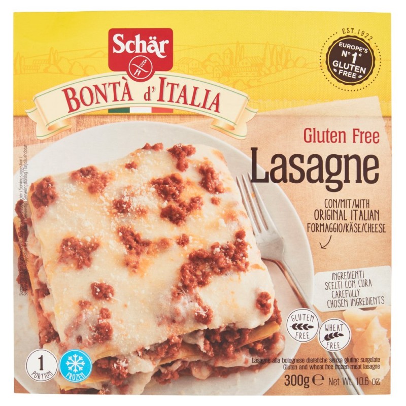 Besciamella [latte scremato reidratato, burro (latte), amido di mais, farina di riso, amido di riso, farina di mais, fibra di mela, sale, noce moscata], Pomodoro 19%, Carne bovina 8%, Amido di mais, Farina di riso, Uova, Carne e pancetta suina 5%, Albume d'uovo, Olio di semi di girasole, Formaggio Grana Padano 1,2% (latte, sale, caglio, lisozima da uova), Sale, Panna (latte), Cipolle, Concentrato di pomodoro 0,6%, Carote 0,5%, Sedano, Addensante: gomma di guar, Emulsionante: mono- e digliceridi degli acidi grassi, Aglio, Antiossidante: estratto di rosmarino, Pepe