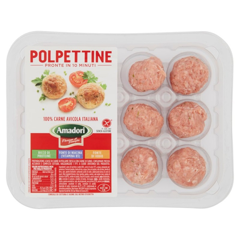 Carne di tacchino e pollo 60%, Carne di suino 19%, Acqua, Preparato per panatura (fecola di patata, farina di riso, acqua, fiocco di patata, olio di oliva, lievito di birra, sale, agente lievitante: carbonato acido di sodio; addensante: farina di semi di guar), Fibre vegetali (limone, lime, bambu', patata, carota), Sale iodato (sale, iodato di potassio 0,007%), Amido di patata, Fiocchi di patate, Aromi naturali, Uovo disidratato, Latte scremato in polvere, Estratto di lievito, Formaggio (latte), Cipolla disidratata, Spezie, Piante aromatiche, Sale, Olio di girasole, Prezzemolo 0,3%, Aromi (con lattosio), Antiossidante: ascorbato di sodio, Correttore di acidita': diacetato di sodio