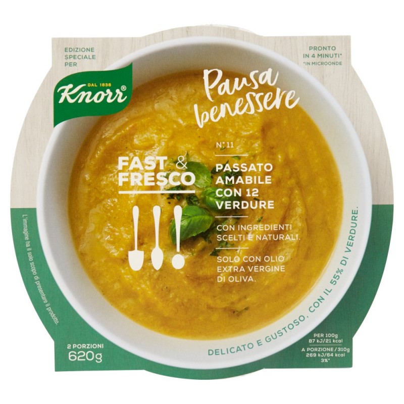 Passato amabile con 12 verdure / Con ingredienti scelti e naturali / 100% vegetale / Solo con olio extra vergine di oliva / Ingredienti: Ortaggi 66% (verza, patata, zucchina, carota, zucca, cipolla, pomodoro, porro, sedano, erbette, lattuga iceberg, aglio), Acqua, Piselli 3%, Olio extra vergine di oliva 0,8%, Sale, Basilico, Prezzemolo, Puo' contenere glutine e lattosio, SENZA GLUTAMMATO E CONSERVANTI AGGIUNTI