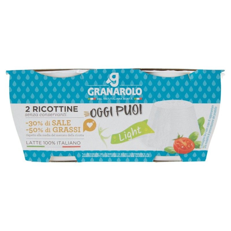 - 2 Ricottine / senza conservanti / -30% di Sale -50% di Grassi rispetto alla media del mercato della ricotta* / Scopri di piu' su www.granarolo.it! / / Un'alimentazione varia ed equilibrata e uno stile di vita sano ti aiutano a vivere meglio. / / *La riduzione del consumo di sodio contribuisce al mantenimento di una normale pressione sanguigna / Ingredienti: Siero di latte pastorizzato, Crema di latte pastorizzato, Correttore di acidita': acido citrico