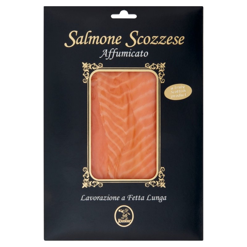 Un salmone unico proveniente dalle isole al nord della Scozia, dove le correnti piu' impetuose e gelide al mondo ci permettono di assaporare una carne soda. Sfilettato e salato a mano, cosi' da conservarsi al meglio e in modo del tutto naturale, viene poi affumicato con una miscela di legni pregiati che gli conferiscono un aroma ed un gusto eccezionale. Il tocco finale e' dato dalla particolare lavorazione a Fetta Lunga che permette di ottenere fette piu' lunghe, sottili e tenere, essendo prive di scarto. / ...un prodotto curato e controllato fin dalla nascita dei salmoni, lavorato con la stessa cura e tradizione di sempre. / / Ricco di acidi grassi Omega-3 / Ingredienti: Salmone (pesce) (Salmo Salar 97%), Sale, Fumo di legno di quercia, Allevato in Scozia (Regno Unito)