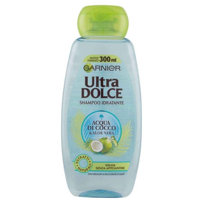 La nuova a gamma Acqua di Cocco & Aloe Vera di Garnier Ultra Dolce e' formulata SENZA PARABENI e SENZA SILICONI utilizzando Acqua di Cocco, riconosciuta come fonte di idratazione naturale e Aloe Vera rinomata per la sua capacita' di trattenere l'idratazione e per le sue virtu' rinfrescanti e lenitive. Una ricetta dissetante, specialmente pensata per capelli disidratati. / Lo SHAMPOO IDRATANTE, grazie alla sua consistenza in gel fondente dal profumo fresco e avvolgente, idrata ed addolcisce i capelli senza appesantirli. I capelli sono idratati, morbidi, di una dolcezza infinita al tatto. / Leggeri e brillanti, risplendono di vitalita' e salute ritrovando tutta la loro naturale bellezza. / Ingredienti: 1161772 A - Ingredients:, Aqua / Water, Sodium Laureth Sulfate, Coco-Betaine, Glycerin, Sodium Chloride, Cocamide MIPA, Aloe Barbadensis Leaf Juice, Sodium Acetate, Sodium Hydroxide, Cocos Nucifera Fruit Juice / Coconut Fruit Juice, Isopropyl Alcohol, Citric Acid, Polyquaternium-10, Hexylene Glycol, Potassium Sorbate, Sodium Benzoate, Salicylic Acid, Linalool, Coumarin, Limonene, Benzyl Alcohol, Benzyl Salicylate, Parfum / Fragrance, (F.I.L C212387/1)