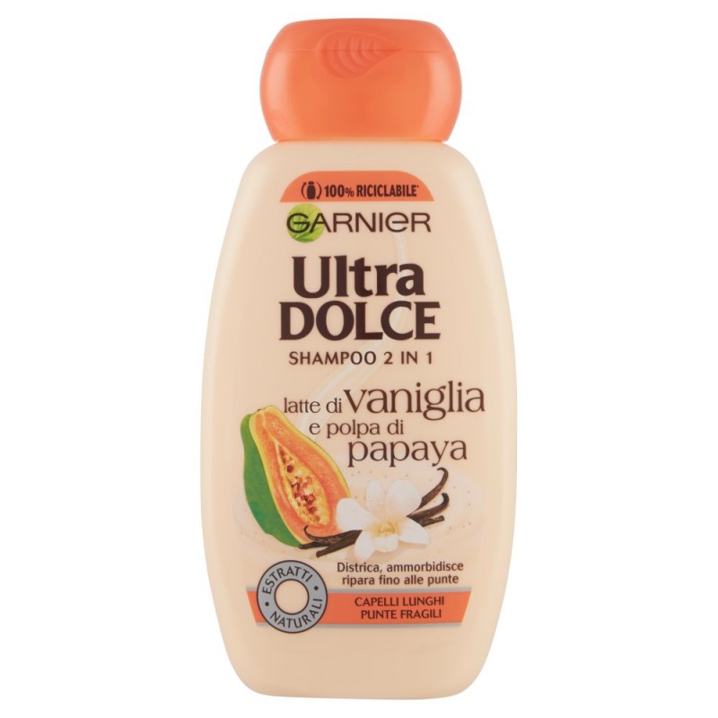 Vera ricetta districante che ripara i capelli lunghi fino alle punte spesso fragili, lo shampoo 2in1 Garnier Ultra DOLCE associa la vaniglia, conosciuta per le sue virtu' di rivitalizzanti, in una formula che non appesantisce i capelli. Capelli perfettamente districati sulla loro lunghezza e riparati fino alle punte, sono piu' belli ed estremamente morbidi al tatto. / Ingredienti: 1099263 C - Ingredients:, Aqua / Water, Sodium Laureth Sulfate, Dimethicone, Coco-Betaine, Glycerin, Glycol Distearate, Sodium Chloride, Guar Hydroxypropyltrimonium Chloride, Sodium Benzoate, Sodium Hydroxide, PPG-5-Ceteth-20, Salicylic Acid, Limonene, Fumaric Acid, Linalool, Vanilla Planifolia Extract / Vanilla Planifolia Fruit Extract, Carbomer, Carica Papaya Extract / Papaya Fruit Extract, Citronellol, Potassium Sorbate, Citric Acid, Hexyl Cinnamal, Parfum / Fragrance, (F.I.L C178209/1)