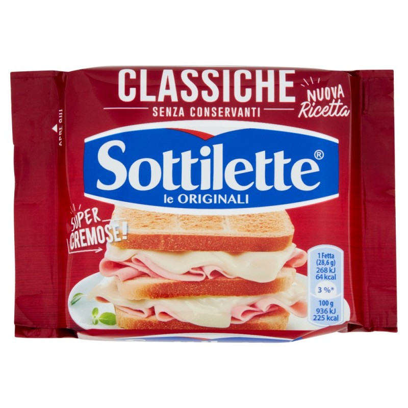 - Lo sapevi che... / Da sempre con formaggio di prima scelta - Da materie prime selezionate! / Senza conservanti e polifosfati - Qualita' Sottilette®! / Perfetta cremosita' - Gustale come ti piace di piu'! / / Adatto ai vegetariani / Ingredienti: FORMAGGI (EMMENTAL e FORMAGGIO a breve stagionatura), LATTE scremato concentrato, Fibre (3 %), Sali di fusione (citrati di sodio), Sale, Correttore di acidita' (acido lattico), Proteine del LATTE, BURRO concentrato, SENZA GLUTINE, FONTE DI CALCIO, PROTEINE E FIBRE