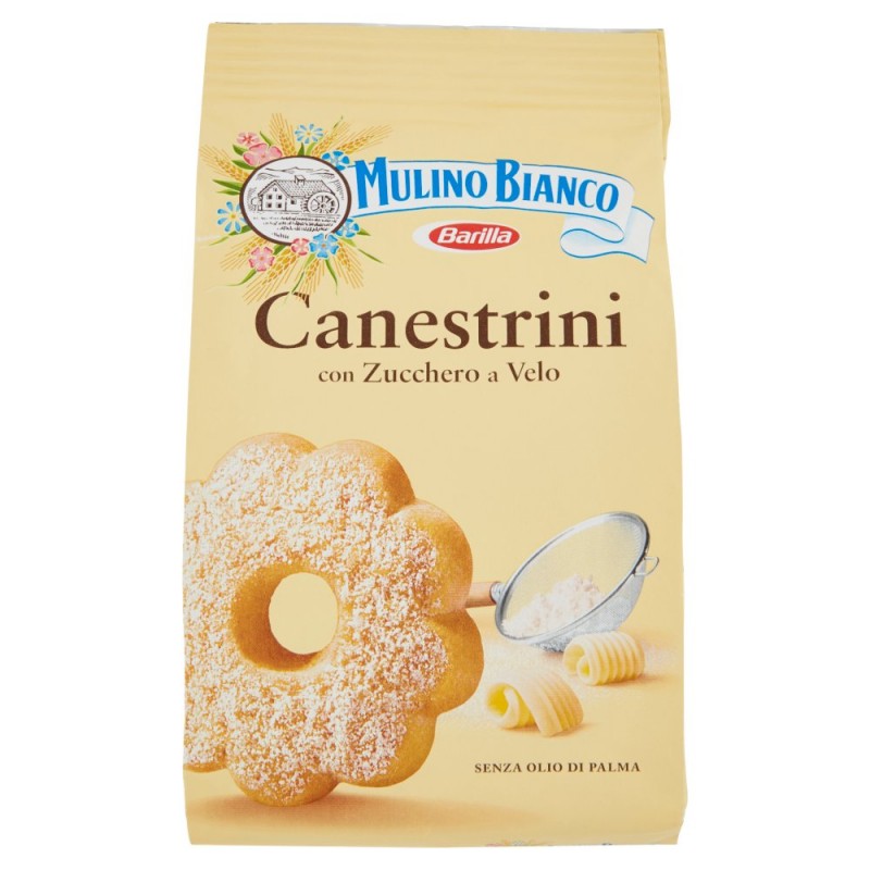 - Tutto il buono che senti / Burro da panna fresca / Uova fresche da gallina allevate a terra / Zucchero a velo / Delicata pasta frolla, realizzata con uova fresche da galline allevate a terra e burro da panna fresca, impreziosita da una spolverata di fine zucchero a velo. I Canestrini: una ricetta artigianale dal sapore senza tempo. / / Il buono che non vedi / - Per la nostra produzione acquistiamo 100% energia elettrica proveniente da fonti rinnovabili / - I dolcetti Mulino Bianco sono preparati senza grassi idrogenati e senza coloranti / www.mulinobianco.it / Ingredienti: Farina di frumento, Zucchero, Burro 10%, Olio di girasole, Amido di frumento, Zucchero a velo 4,2% (zucchero, amido di frumento), Uova fresche 3,8%, Tuorlo d'uovo 2,4%, Agenti lievitanti (carbonato acido d'ammonio, carbonato acido di sodio, tartrato monopotassico), Aromi, Sale, Puo' contenere tracce di arachidi, frutta a guscio, semi di sesamo e soia