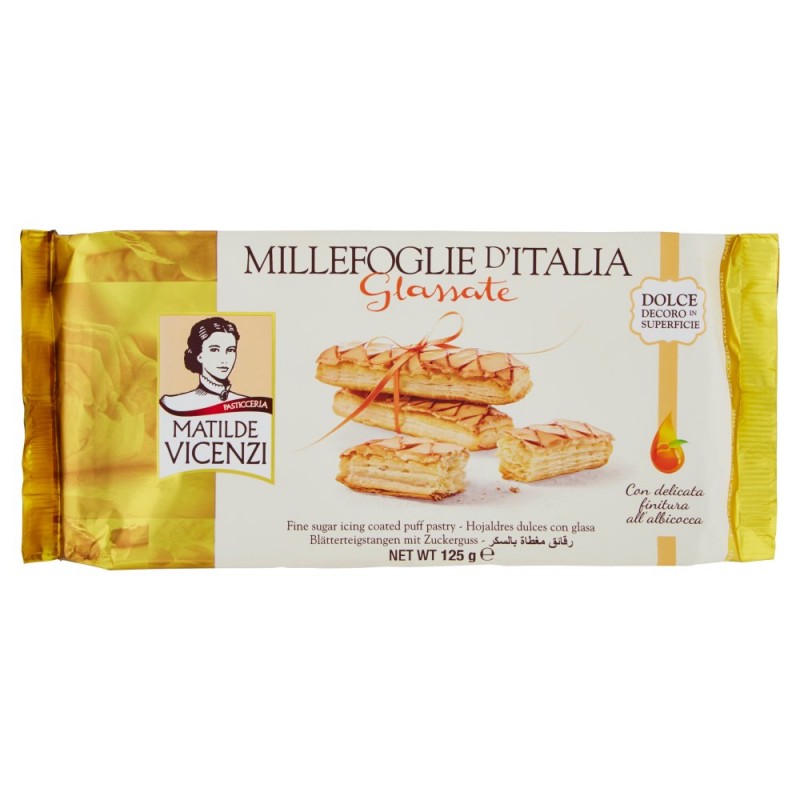 - ''Care amiche, vi offro la deliziosa fragranza delle mie Glassate: una delicata finitura di albicocca per aggiungere un tocco di dolcezza alle mie Millefoglie d'Italia.'' / Matilde Vicenzi / Ingredienti: Farina di frumento, Glassa 25% (zucchero, albume d'uovo, acidificante: acido citrico, aromi), Margarina vegetale (olio di palma, olio di girasole, acqua), Sciroppo di glucosio-fruttosio, Purea di albicocche 1%, Gelificante: pectina, Sale, Burro, Puo' contenere tracce di frutta secca a guscio e prodotti derivati dal latte