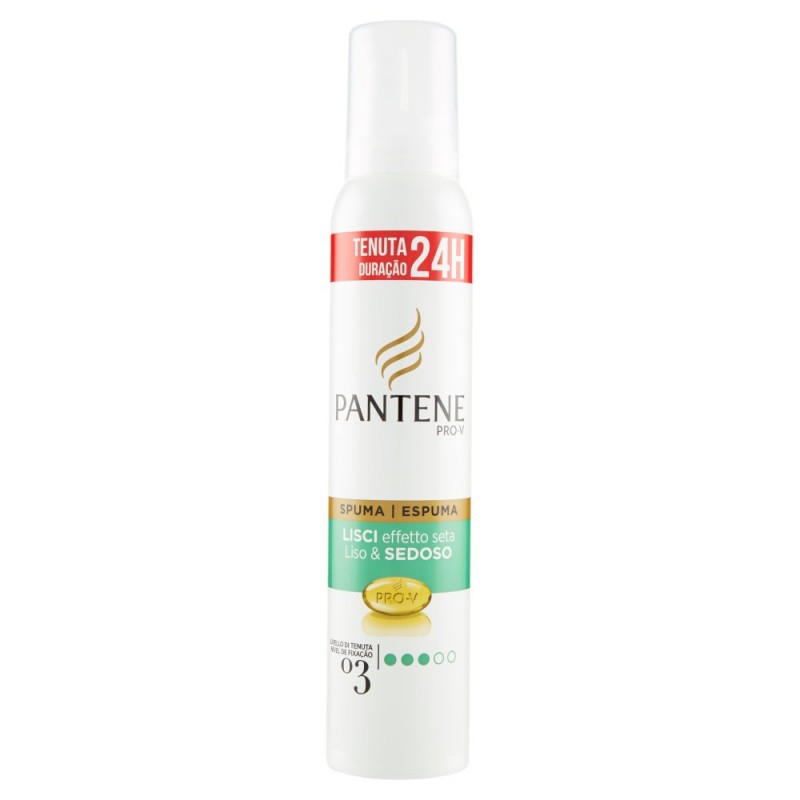 - Tiene sotto controllo l'effetto crespo per capelli meravigliosamente lisci / Spuma Lisci Effetto Seta: / - Aiuta a prevenire l'effetto crespo anche in caso di elevata umidita' / - Lascia i tuoi capelli meravigliosamente lisci / - Mantiene il tuo look sotto controllo pur lasciando i capelli elastici e morbidi / Formula avanzata Pantene Pro-V: / La nostra spuma con un Complesso-Lisciante e' formulata per prevenire l'effetto crespo lasciando i capelli elastici, morbidi e lisci. / Ingredienti: Aqua, Propane, Butane, Polyquaternium-11, Isobutane, PVP, VP/VA Copolymer, Phenoxyethanol, Chitosan, Polyquaternium-16, Parfum, Laureth-4, Disodium EDTA, Formic Acid, Methylparaben, Cetrimonium Chloride, Panthenyl Ethyl Ether, Caprylyl Glycol, Panthenol, Hexyl Cinnamal, Hydroxycitronellal, Citric Acid