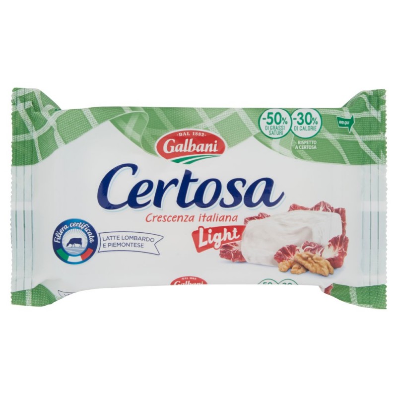 Certosa, la crescenza dal gusto fresco e genuino / - Solo latte Lombardo e Piemontese, raccolto vicino a dove produciamo / - Filiera Certificata, garantita dal latte al prodotto finito. Scopri di piu' su www.galbani.it / - Naturalmente ricca in calcio e fosforo. Senza conservanti. / - A ridotto contenuto calorico (-30% di calorie) e con il 50%di grassi saturi in meno rispetto a Certosa classica / Ingredienti: Latte parzialmente scremato, Sale, Caglio, Fermenti lattici vivi, Senza conservanti