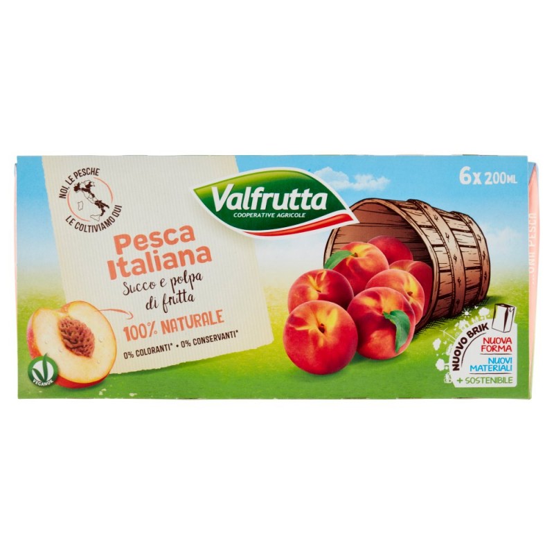 Scopri perche' i succhi Valfrutta sono cosi' buoni! / E' una ricetta semplice che piace ai grandi e ai bambini: / - Frutta Selezionata / solo la frutta migliore. / - Frutta 100% Naturale / senza aromi / senza conservanti / senza coloranti.* / *A norma di legge. / / Nuovo brik / - Nuova forma / Piu' moderna ed ergonomica / - Nuovi materiali / 86% da materiali rinnovabili vegetali / - + Sostenibili / -14% Emissioni di CO2 / Rispetto alla confezione precedente / / Scopri i divertenti brik / Ingredienti: Purea di pesca, Acqua, Zucchero, Succo di limone da concentrato, Vitamina C