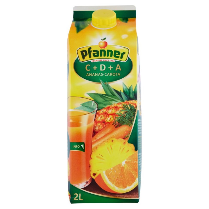 - Ananas mature, arance succose, limoni frizzanti e carote croccanti: CDA Pfanner e' la formula vitaminica gustosa per un inizio di giornata all'insegna della freschezza. La bevanda Pfanner combina in maniera ideale il meglio della frutta e della verdura e copre con soli 200 ml coprono il 30% fabbisogno giornaliero di vitamine C, D e A. / Ingredienti: Acqua, Succo di piu' frutti da concentrato (ananas (20%), arancia, limone), Zucchero, Succo di carota da concentrato, Acidificante acido citrico, Correttore di acidita' citrato di sodio, Aroma, Vitamine (C, E), Beta-carotene, Senza glutine
