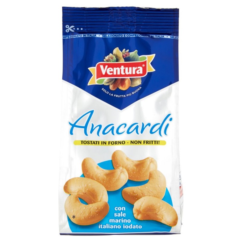 Tostati in forno senza alcuna aggiunta di olio e subito confezionati per mantenerne intatto il sapore: ecco il segreto degli Anacardi Ventura, dorati, invitanti, di una croccantezza unica. / / Li abbiamo insaporiti con sale marino italiano arricchito di iodio. / Ingredienti: Anacardi sgusciati, Presal sale fino iodato protetto 1% (sale marino, iodato di potassio 0,007%), Aroma naturale, Puo' contenere tracce di arachidi, altra frutta a guscio e solfiti