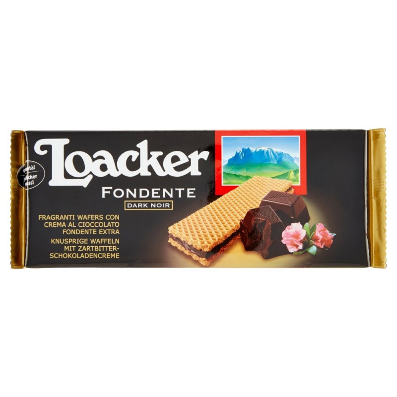 Loacker / Garanzia di qualita' / - 8% di cioccolato fondente nella crema / - senza coloranti ne' conservanti / - senza grassi idrogenati / Ingredienti: Farina di frumento, Olio di cocco, Sciroppo di glucosio, Zucchero, Cacao magro, Destrosio, Cioccolato fondente 8% nella crema (pasta di cacao, zucchero), Farina di soia, Siero di latte in polvere, Latte scremato in polvere, Estratto di malto d'orzo, Agenti lievitanti (carbonato acido di sodio, difosfato disodico), Nocciole, Sale, Emulsionante lecitine di soia, Bacche di vaniglia Bourbon, Spezie, Puo' contenere mandorle