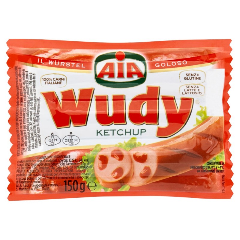 Carni di pollo e tacchino separate meccanicamente (84%), Ketchup (8%) (acqua, doppio concentrato di pomodoro, saccarosio, aceto di alcool, sale, addensanti: E1422, amido modificato di mais, antiossidante: E300, aromi, estratto di spezie), Sale, Pomodoro in polvere, Olio di girasole, Gelatina, Aromi, Esaltatori di sapidita': E621, Antiossidanti: E301, Amido di patata, Stabilizzanti: E450-E452, Addensanti: E412-E415-E410, Conservanti: E250, Aroma di affumicatura, Senza glutine