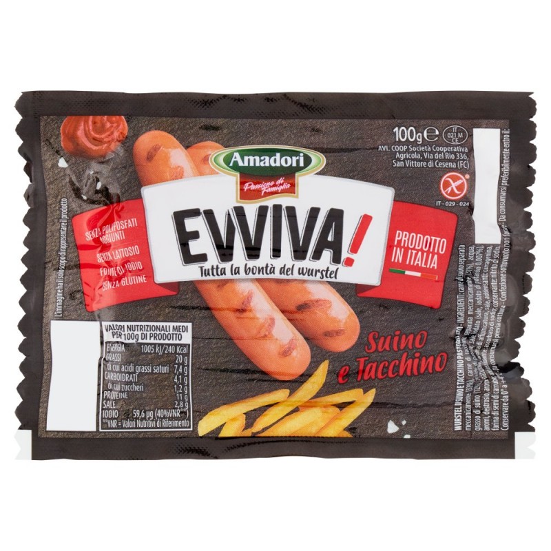Carne di suino separata meccanicamente (32%), Carne di tacchino separata meccanicamente (31%), Acqua, Grasso di suino (12%), Amido di patata, Sale iodato (sale, iodato di potassio 0,007%), Aromi, Destrosio, Aroma naturale, Aroma di affumicatura, Sale, Addensanti: carragenina, farina di semi di carrube, Antiossidante: ascorbato di sodio, Conservante: nitrito di sodio