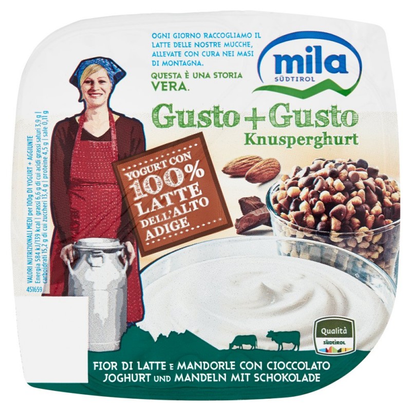 - Yogurt (132 g): yogurt di latte intero, preparazione dolciaria 6% (zucchero, amido modificato di tapioca, aromi, correttore di acidita': acido citrico), zucchero 1,8%, Granella di mandorle e cioccolato (18 g): mandorle caramellate (mandorle, zucchero, sciroppo di glucosio), gocce di cioccolato (zucchero, latte in polvere, burro di cacao, massa di cacao, siero di latte in polvere, emulsionante: lecitina di soia; aromi), Puo' contenere altra frutta a guscio e glutine