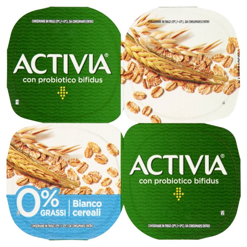 - Activia contiene 4 miliardi di probiotico bifidus che favoriscono l'equilibrio della flora intestinale. / / 4 miliardi di probiotico bifidus / equilibrio flora intestinale / Ingredienti: Latte scremato fermentato con Lactobacillus bulgaricus, Streptococcus thermophilus, Probiotico: Bifidus Actiregularis (Bifidobacterium lactis CNCM I-2494) 84%, Preparato di frutta e cereali 16% (purea di mela, oligofruttosio, succo concentrato d'uva, cereali 8% (fiocchi di frumento, avena, orzo, crusca di frumento), fruttosio, addensanti (amido modificato, pectina), aromi, correttori di acidita' (acido citrico, citrato di calcio, citrato di sodio), edulcoranti (acesulfame K, sucralosio)), Contiene: latte, frumento, avena e orzo, Puo' contenere tracce di frutta a guscio e di altri cereali contenenti glutine