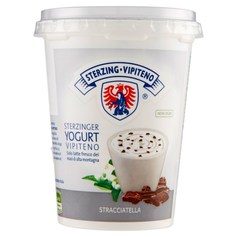 - Yogurt intero con fermenti lattici, Preparato alla stracciatella (zucchero, scaglie di cioccolato 2,2% sul totale (pasta di cacao, burro di cacao, zucchero, emulsionante: lecitina di girasole), sciroppo di glucosio-fruttosio, amido modificato di mais, aroma, xanthan), Senza glutine
