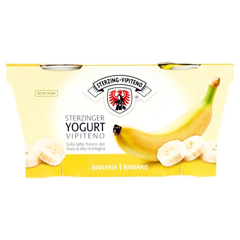Yogurt intero con fermenti lattici, Preparato alla banana (banane 8% sul totale, zucchero, sciroppo di glucosio-fruttosio, gelificante: pectina; aroma), Senza glutine