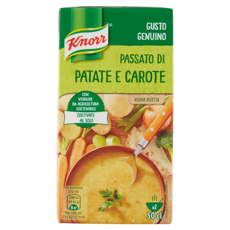Un piatto di passato patate e carote equivale ad 1 delle 5 porzioni giornaliere di frutta e verdura (80 g) raccomandate, dall'organizzazione mondiale della sanita', per una dieta sana ed equilibrata. Inoltre il passato di patate e carote Knorr e' naturalmente fonte di fibre ed e' adatto ad un regime vegetariano. / / Senza: / Conservanti aggiunti / Glutammato aggiunto / Coloranti / / Abbiamo selezionato per te queste 7 verdure dell'orto per creare un delizioso passato di patate e carote / Patate, carote, porri, fagiolini, broccoli, cipolle, sedano rapa / Ingredienti: La nostra ricetta, Acqua, Verdure* (patate 16%, carote 13%, sedano rapa 8,5%, cipolle 3,2%, porri 2,7%, broccoli 2,4%, fagiolini 2,4%), Crema di latte, Amido modificato di mais, Sale, Olio di girasole, Estratto di lievito, Latticello in polvere, Puo' contenere glutine, uovo, senape, *Da agricoltura sostenibile