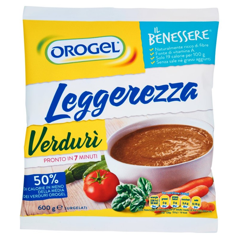 Verduri' Leggerezza / Un passato di verdure senza legumi, indicato per chi desidera seguire un'alimentazione salutare e leggera, non rinunciando al sapore. Senza sale ne' grassi aggiunti, cosi' puoi condirlo a piacere. / Il Verduri' Leggerezza non contiene grassi e quindi fornisce il 50% di calorie in meno della media dei Verduri' Orogel. / / Le raccomandazioni nutrizionali sottolineano l'importanza di consumare ogni giorno alimenti ricchi di fibre. Come il Verduri' Leggerezza fonte anche di vitamina A che aiuta a mantenere in buona salute la pelle e la vista e contribuisce al buon funzionamento del sistema immunitario. / Ingredienti: Verdure 60% (zucchine, carote, patate, spinaci, broccoli, fagiolini, pomodoro, porro, zucca, sedano, basilico), Acqua, Senza glutine